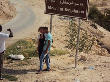 Als je goed kijkt kun je zien dat je tegenwoordig met een kabelbaan naar boven kunt gaan én dat een Palestijnse Arabier onze reisgids probeert in te palmen, vóór het bord “Mount of Temptation”.