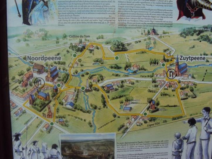 Onze gids in Maison de la Bataile in Noordpeene, een jonge man, was alleraardigst en enthousiast om ons persoonlijk in te wijden in de achtergronden van deze slag, door vooral eerst te vragen aan welke kant bij zouden staan en waar wij dachten dat ‘onze troepen’ gelegerd waren. Dat deed hij bovendien in het Vlaams, dat de meeste mensen tot voor kort nog in deze streek spraken. Hij was in feite een verpersoonlijking van deze historische veldslag, doordat hij zich heel goed bewust was, dat als deze slag anders had uitgepakt, hij nu Vlaams was geweest. Hij klonk haast alsof hij dat liever had gehad. Op een paneel met uitleg, kwamen wij naast het Nederlands en Frans ook een uitleg tegen in het Vlaams. Dit Vlaams deed ons erg sterk denken aan Zuid-Afrikaans. Nu schijnt het dat het Vlaams van de Zuid-Afrikaanse boeren mogelijk inderdaad teruggaat of het Vlaams en de geuzen uit deze streek. Zo leer je nog eens wat!