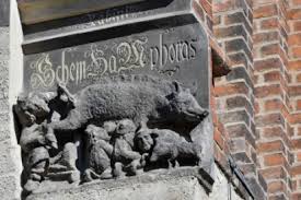 afschuwelijke verhaal over een joods zwijn. Hij schrijft: “Hier in Wittenberg heeft de kunstenaar voor de katholieken van de parochiekerk een zeug uit steen gebeiteld. Onder de zeug liggen biggen en joden, die melk zuigen. Achter de zeug staat een rabbijn, die de rechterpoot van de zeug opheft en met zijn linkerhand trekt hij de staart over zich heen. Hij staart onder de staart in de Talmoed, alsof hij iets heel bijzonders wil lezen. Dáár hebben joden wis en waarachtig die woorden “Schem Hamphoras” gelezen”. Hetgeen in de kabbala een aanduiding is voor de verbogen naam van God.